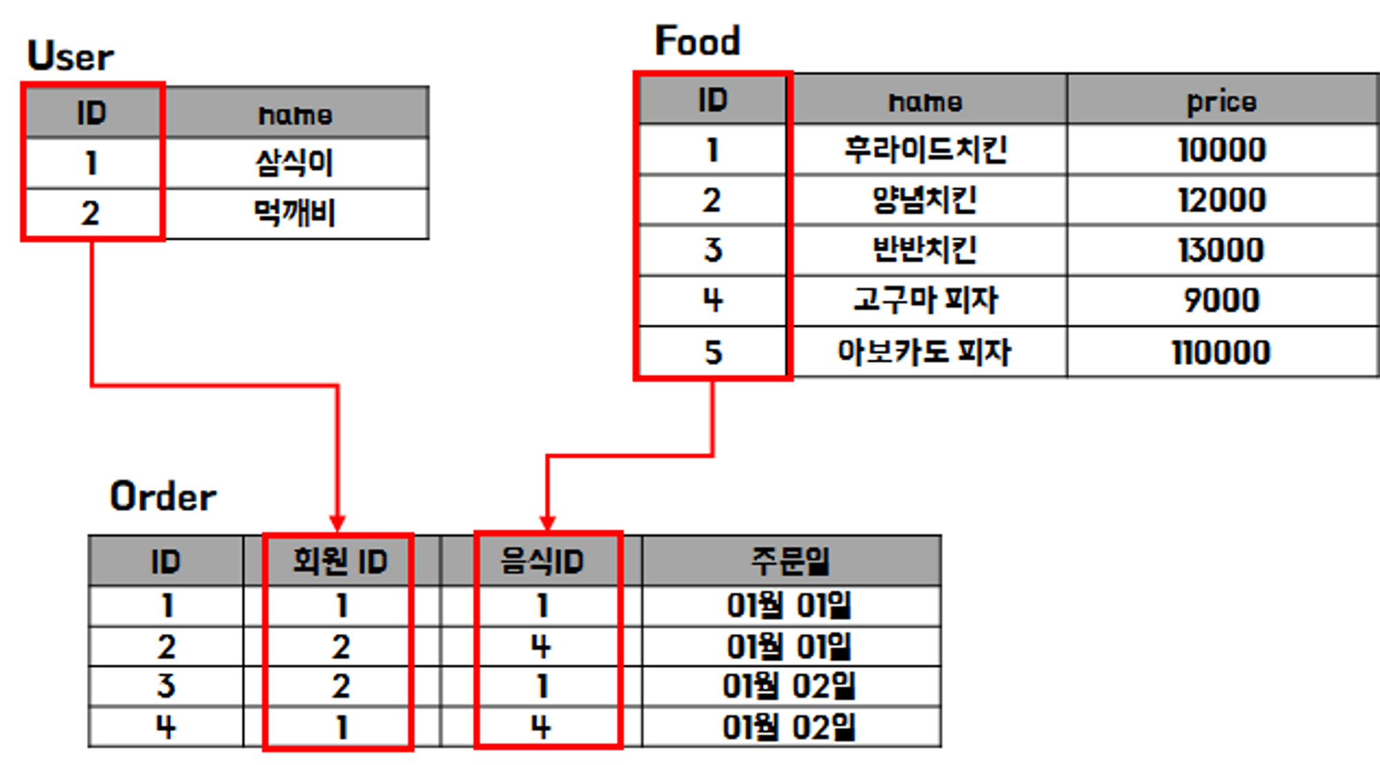 User와 Food라는 테이블이 있음